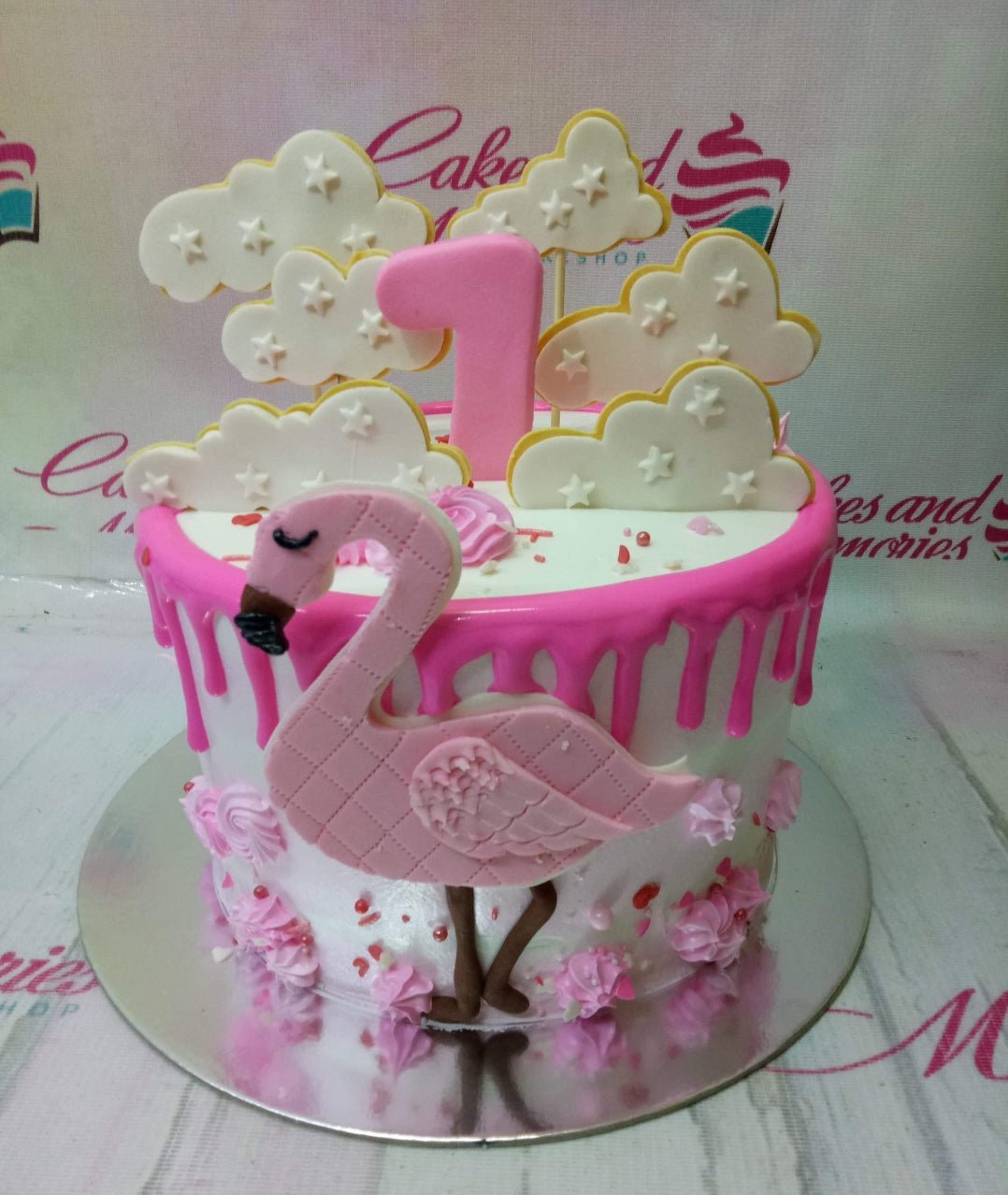 Pink flamingo themed birthday cake with pink icing drips, fondant clouds, and a large pink number one topper.