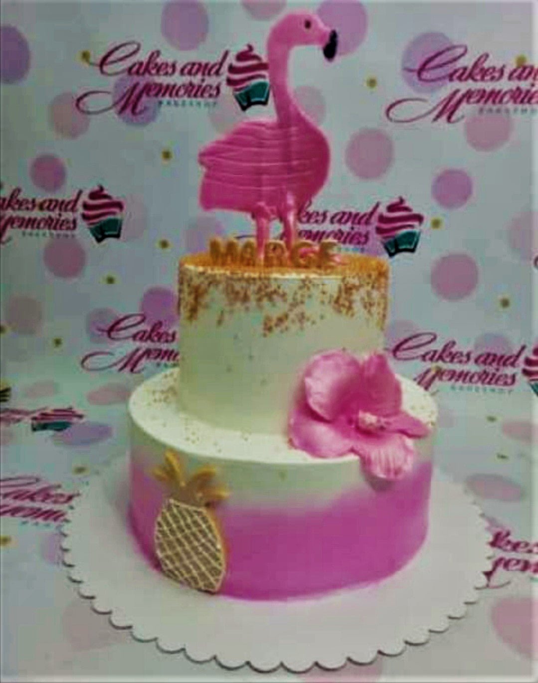 Two-tier tropical flamingo cake with pink gradient icing, a large pink flamingo topper, and a gold pineapple decoration.