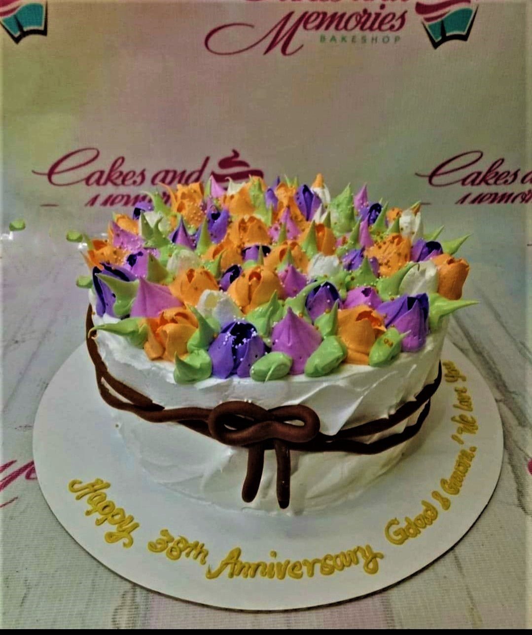 White soft-icing cake topped with a dense garden of purple, orange, and white icing flowers with green leaves and a brown icing bow.