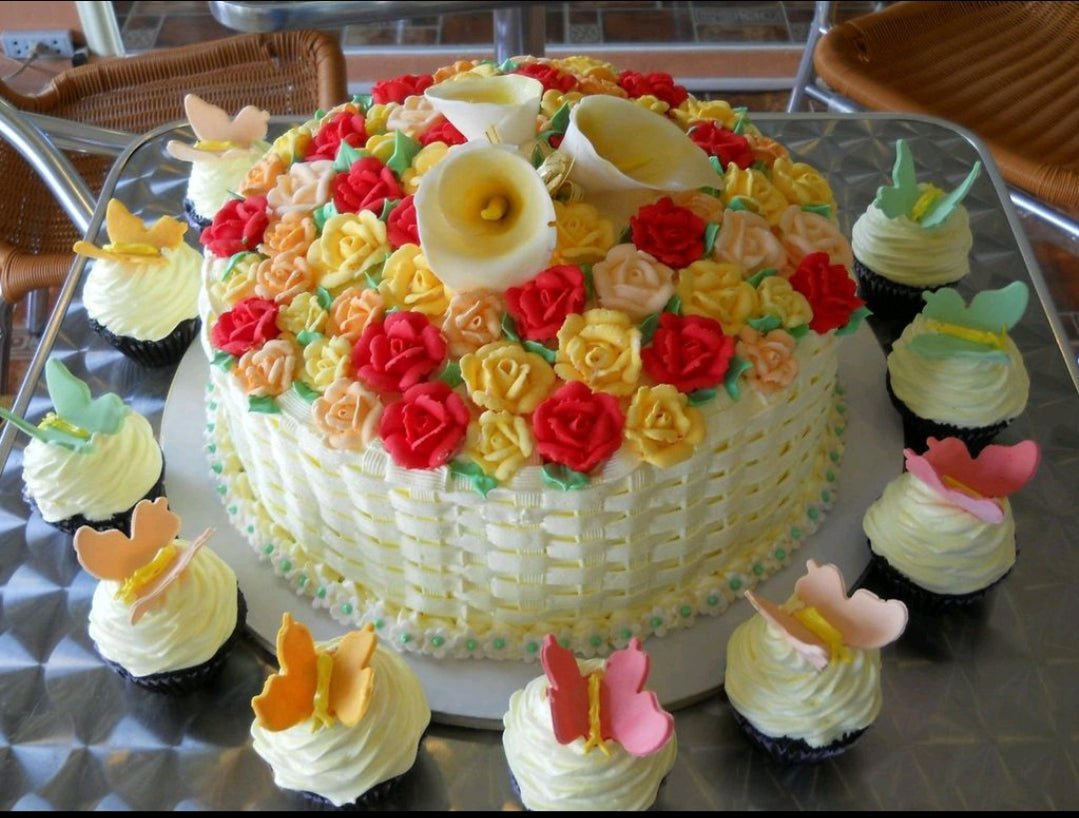 A white basketweave cake topped with a dense bouquet of red, yellow, and peach icing roses and white calla lilies, surrounded by cupcakes.