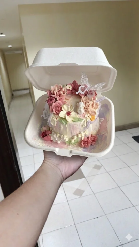 Bento cake in a clamshell box decorated with intricate pink and peach icing flowers, a white butterfly, and a small angel figurine.