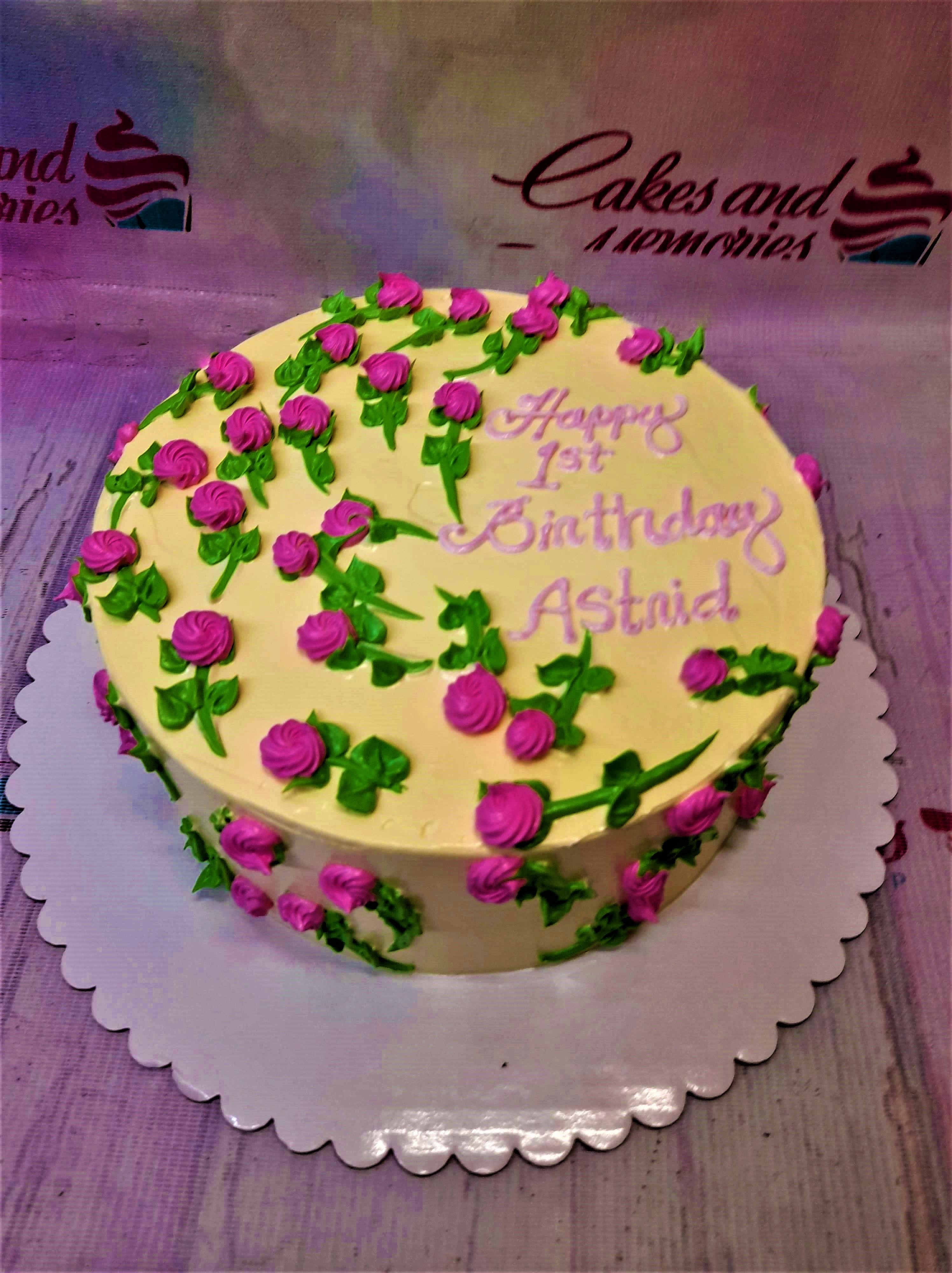 Round light yellow birthday cake decorated with numerous pink icing rosettes and green leaves on the top and sides.