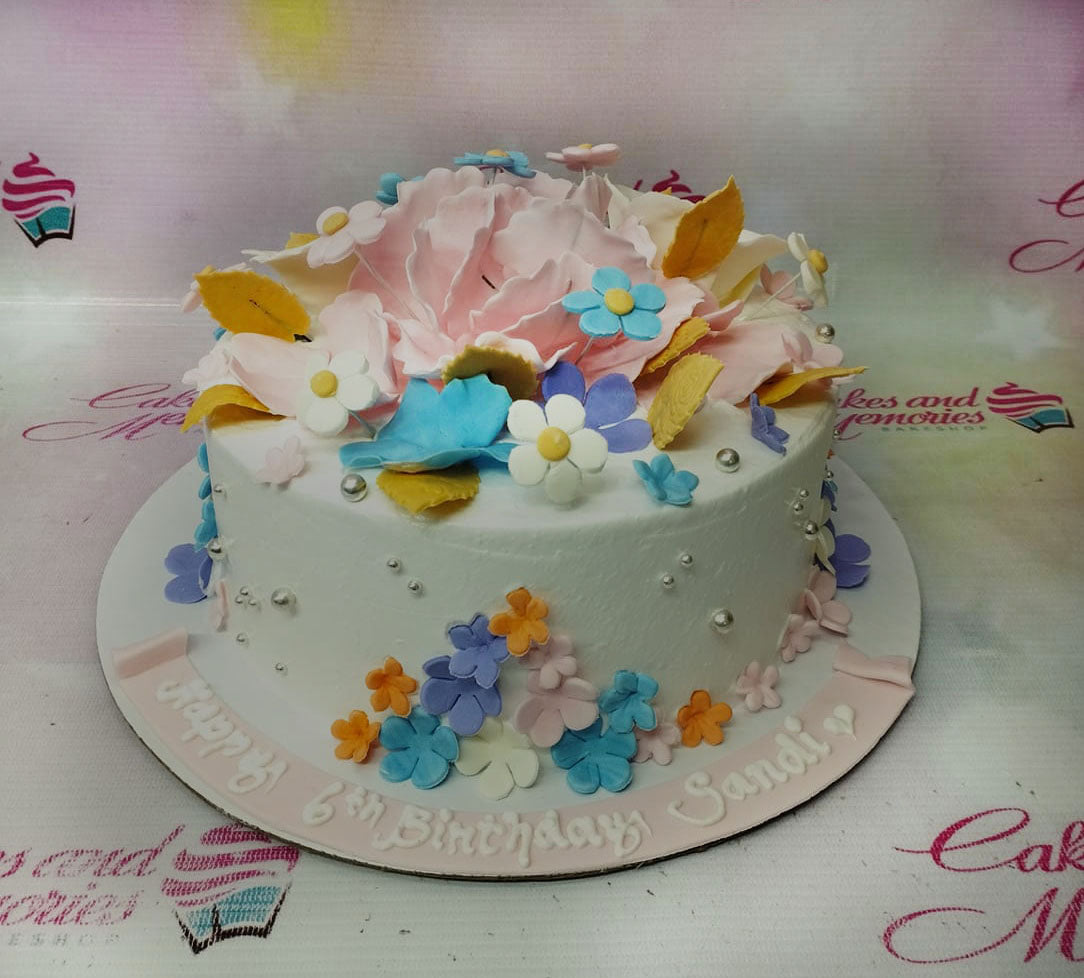 White round birthday cake decorated with pink, blue, and purple gumpaste flowers and silver dragees with a pink message ribbon.