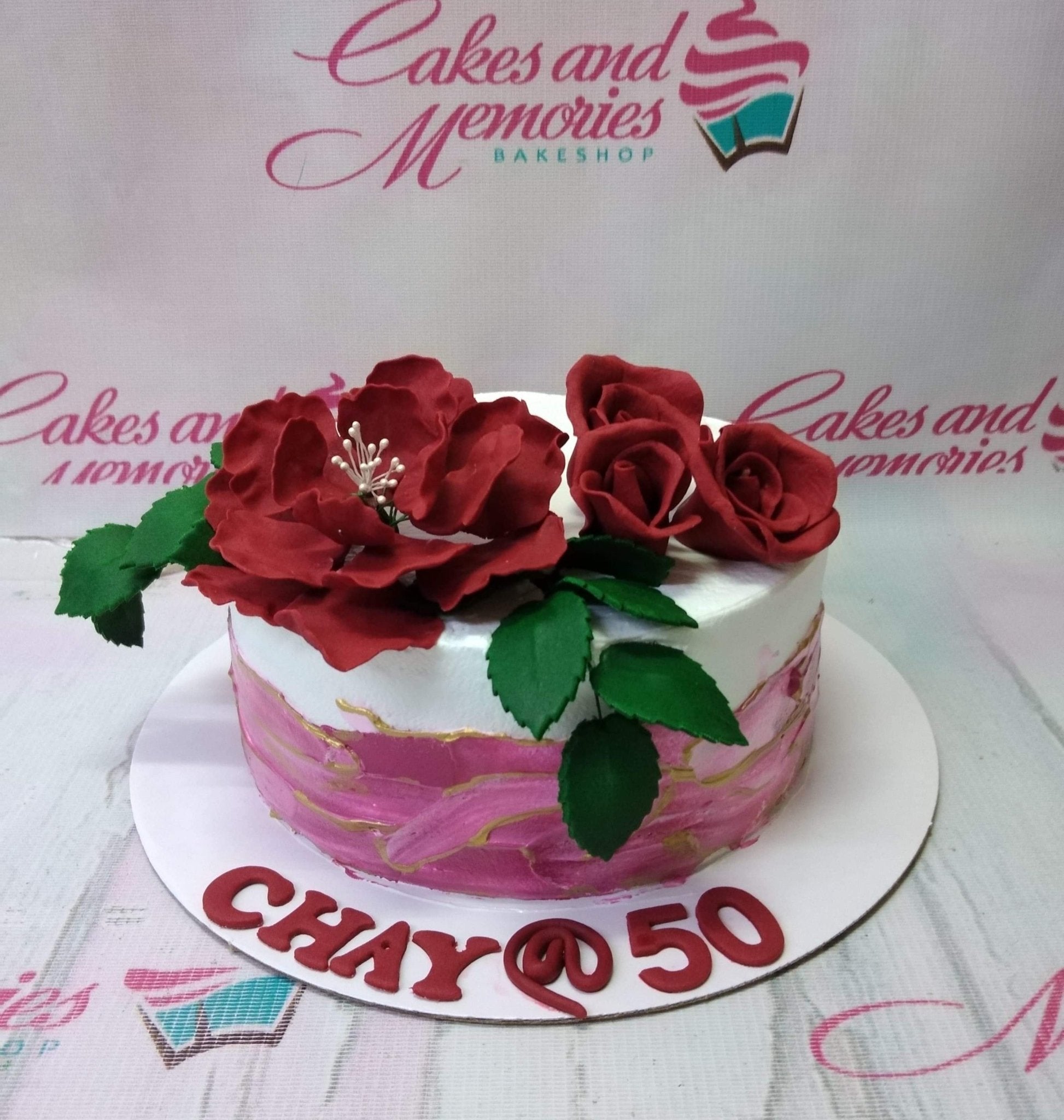 White and pink 1-tier birthday cake with large red gumpaste flowers and green leaves, featuring a pink palette knife finish and gold accents.