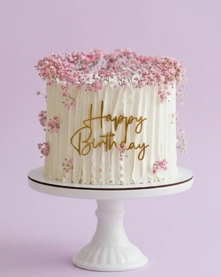 Elegant white ruffled icing cake with pink baby's breath flowers and a gold Happy Birthday topper.