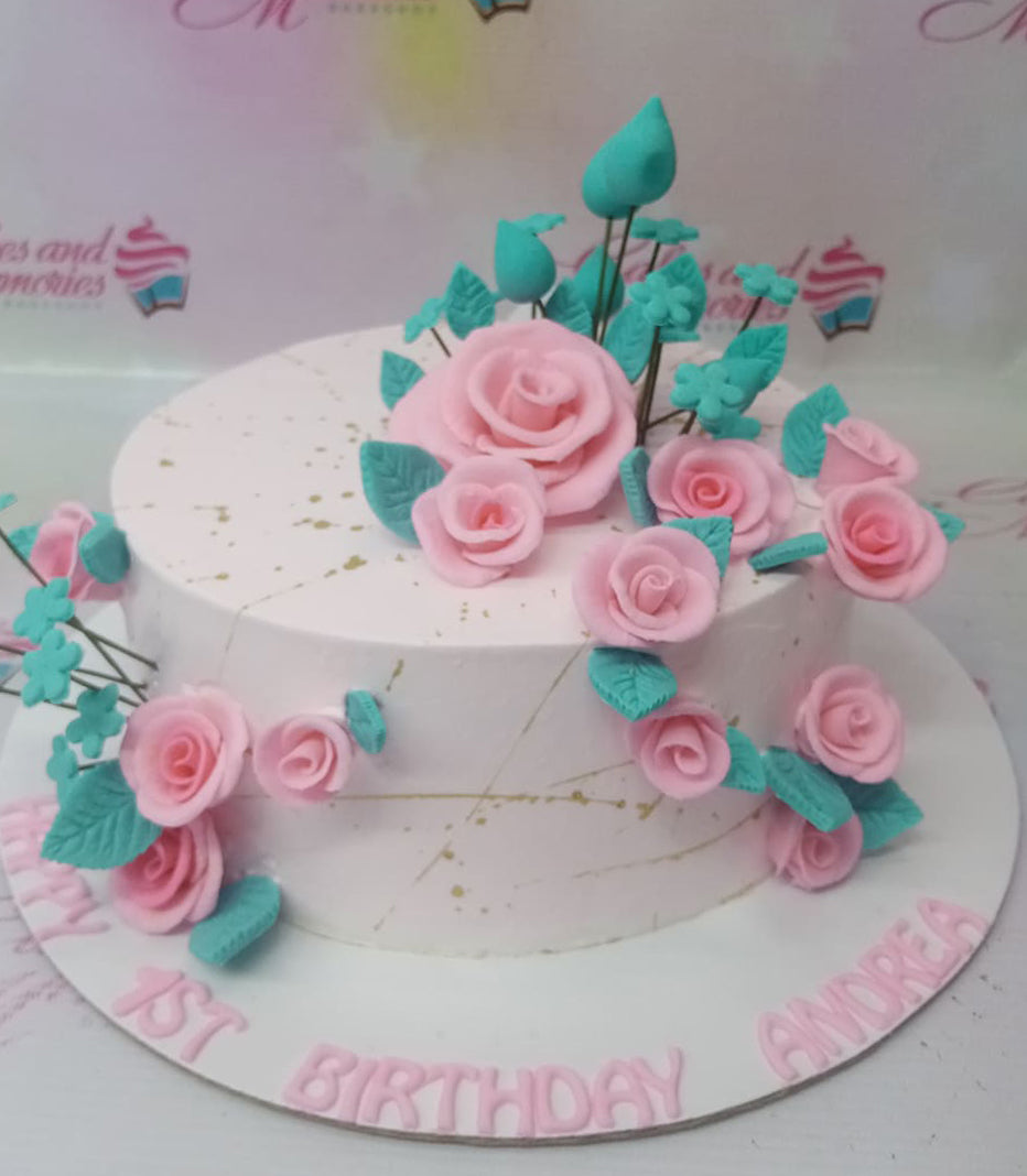 White 1-tier birthday cake with pink gumpaste roses, teal leaves, and gold splatter accents.