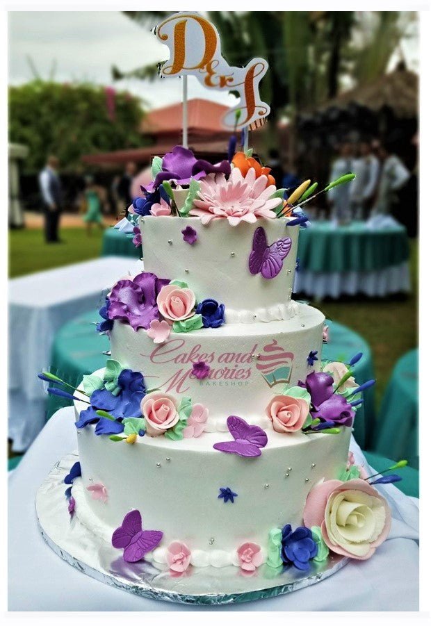 Elegant 3-tier white floral wedding cake with purple butterflies and pink roses