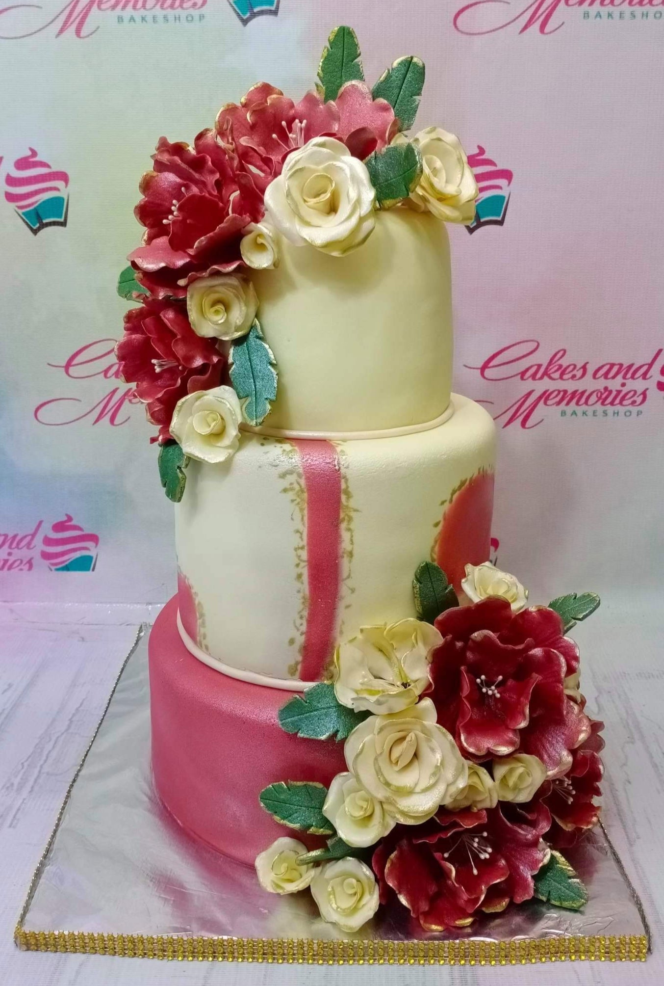 Elegant 3-tier floral cake with ivory and deep red fondant, featuring large gumpaste roses and peonies with gold accents.