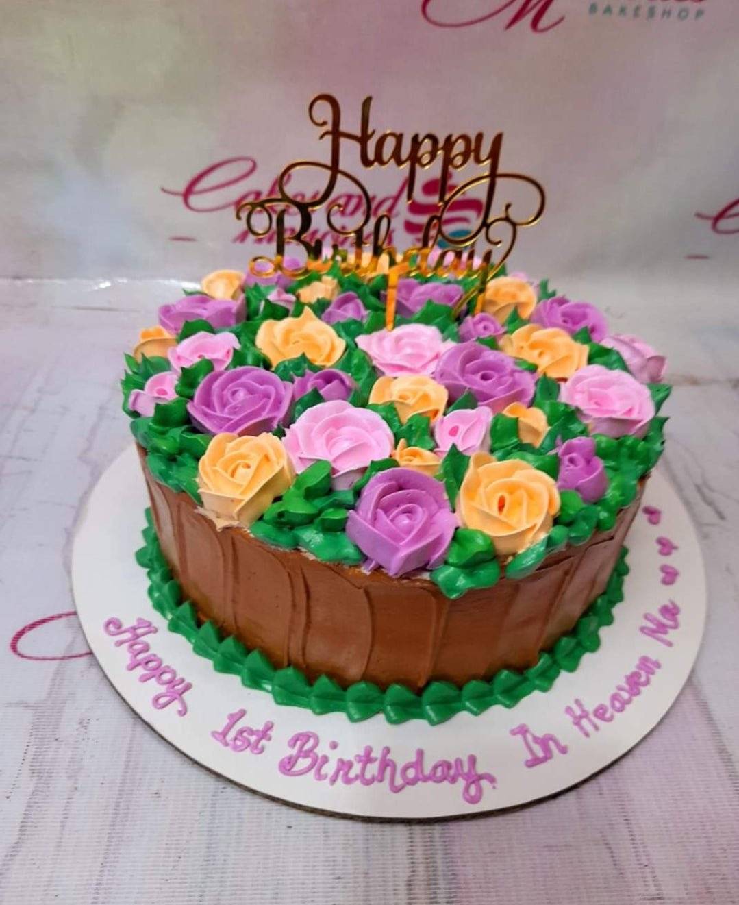 Brown round cake topped with a dense garden of pink, purple, and yellow icing roses with green leaves and a gold Happy Birthday topper.