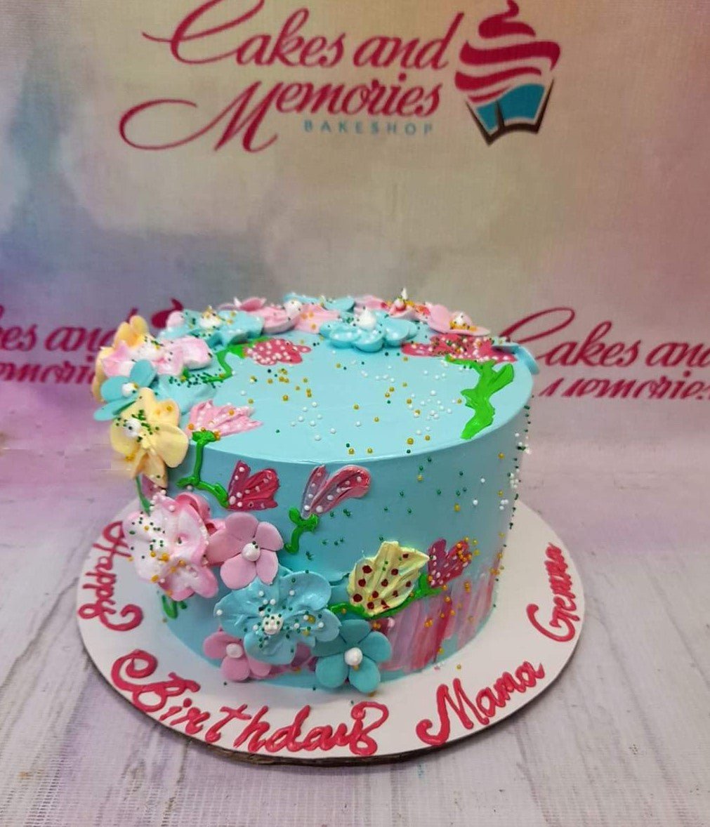 Light blue birthday cake with intricate piped icing flowers in pink, yellow, and teal with gold sprinkles and a message on the base board.