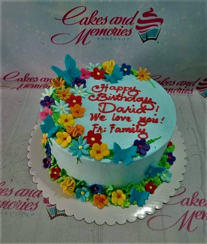 Light blue birthday cake decorated with colorful gumpaste flowers and butterflies with a red icing message.