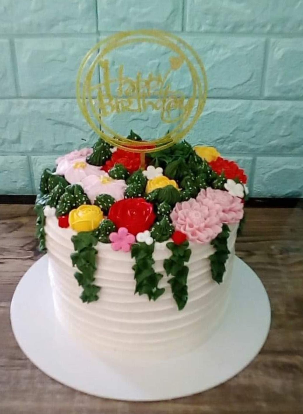 White 1-tier birthday cake with horizontal icing ridges and a lush garden of pink, red, and yellow edible flowers on top.