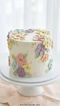 Elegant white single tier cake decorated with colorful palette knife icing flowers in pink, purple, yellow, and blue with gold leaf accents.