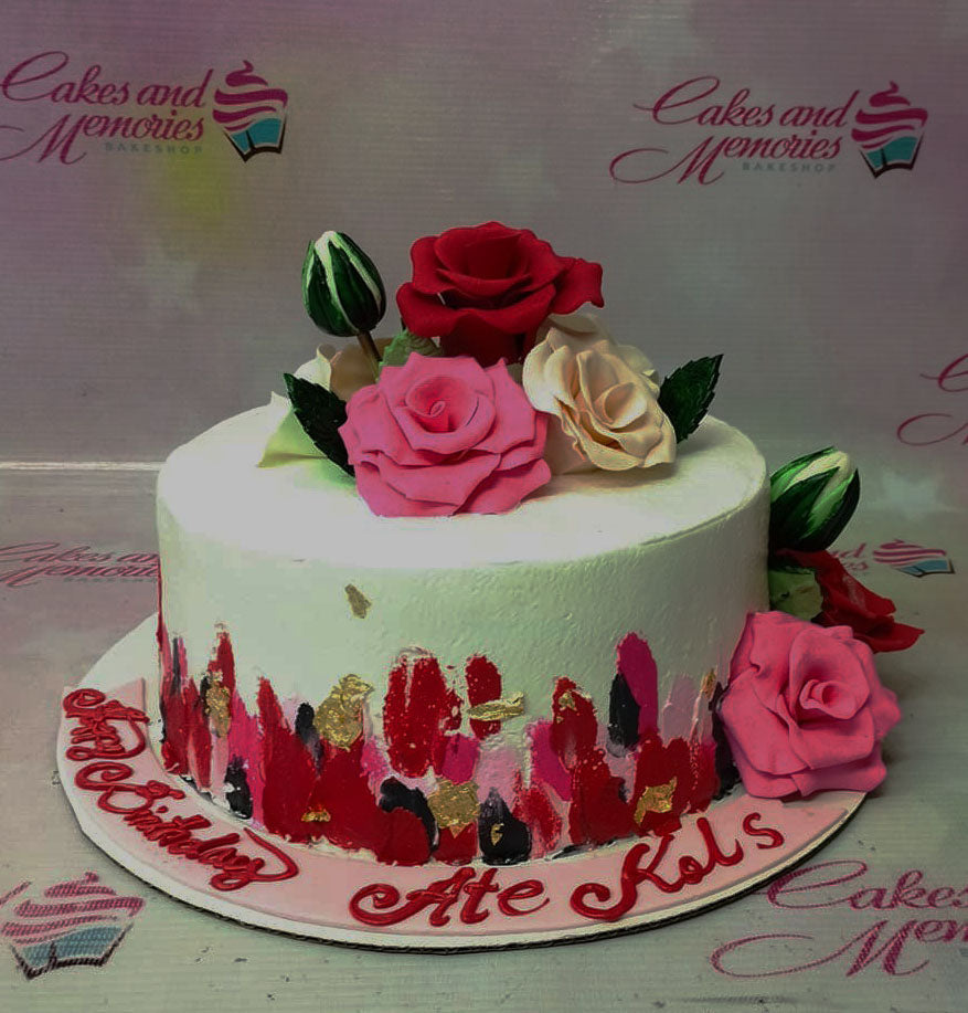 White round cake with pink and red palette knife icing strokes, gold leaf accents, and topped with pink, red, and cream gumpaste roses.