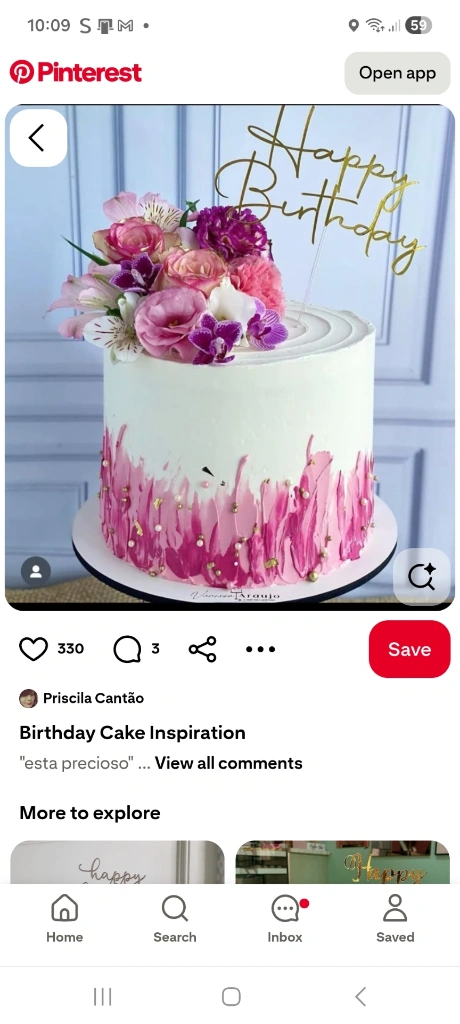 White 1-tier birthday cake with pink palette knife icing, fresh flowers, and a gold Happy Birthday topper.