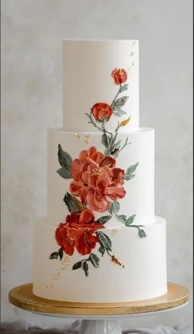 Elegant 3-tier white wedding cake featuring intricate orange and red palette knife floral icing decorations with gold leaf accents.