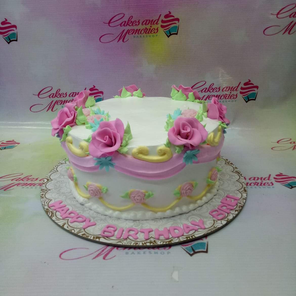 White round cake with pink icing roses, yellow swags, and a pink birthday message on the base board.