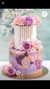 A multicolor 2-tier cake featuring pink and purple roses and gold icing drip.