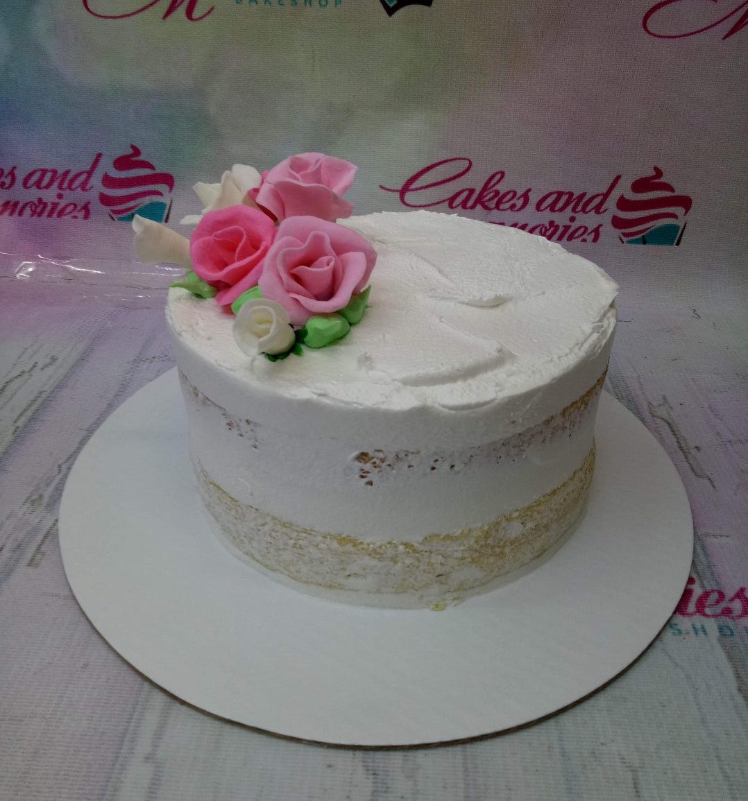 White semi-naked cake with pink and white gumpaste roses and green leaves on a white base board.