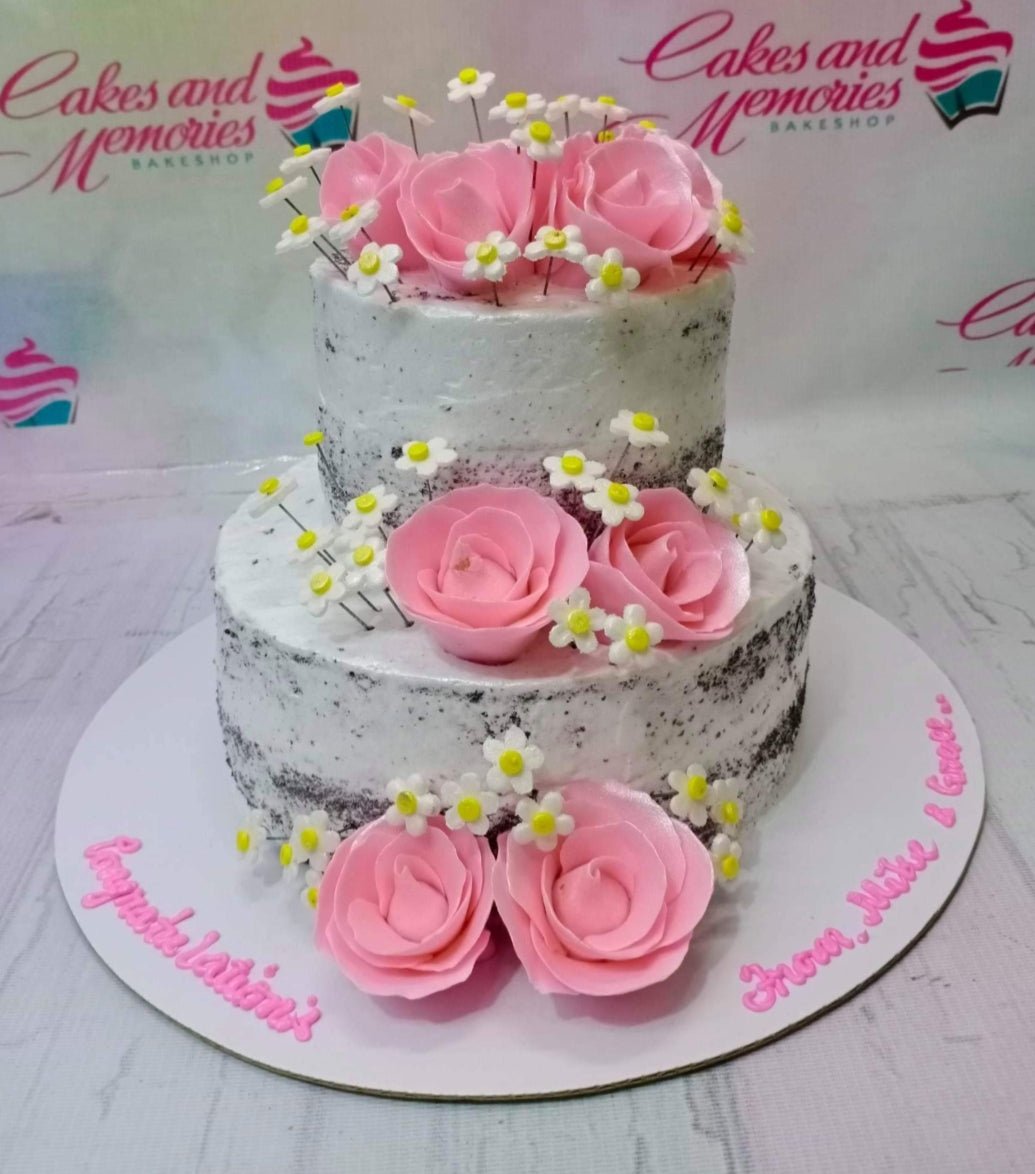 Two-tier white semi-naked cake decorated with large pink gumpaste roses and small white daisies with yellow centers.