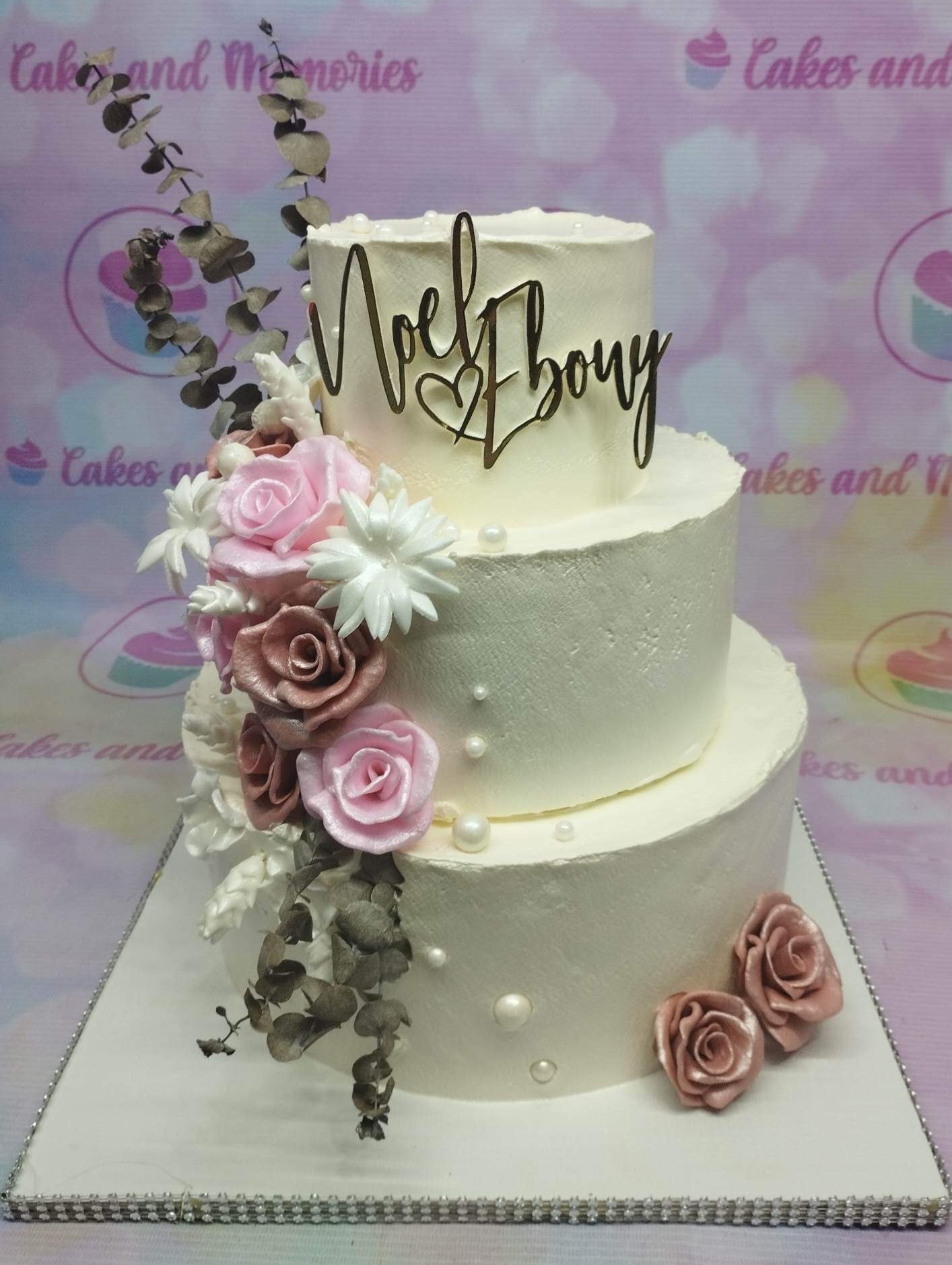 Elegant 3-tier white textured soft icing cake with pink and rose gold gumpaste roses, white daisies, and a gold acrylic name topper.