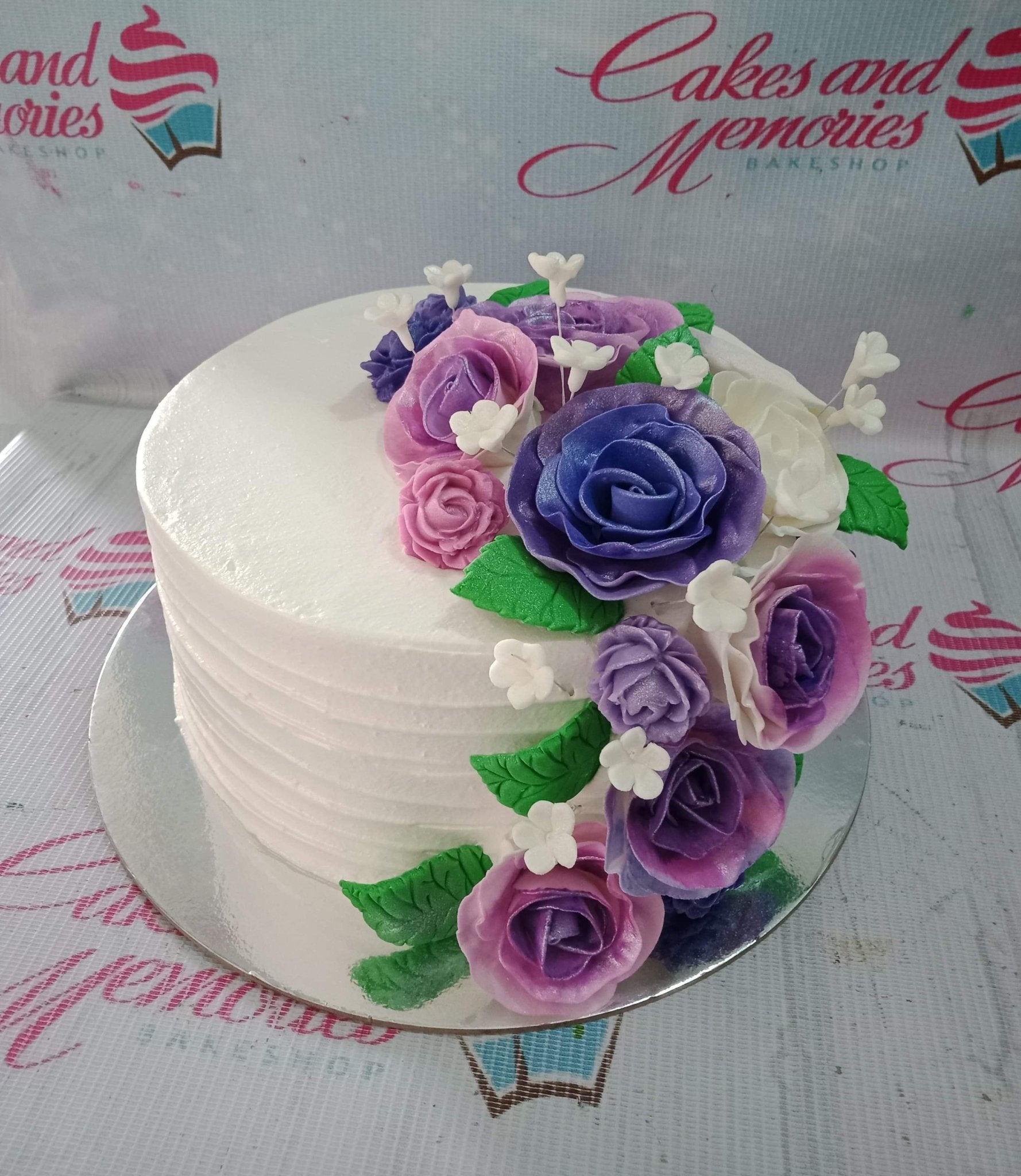 White soft-icing cake decorated with a cascading arrangement of purple, pink, and white gumpaste roses and green leaves.