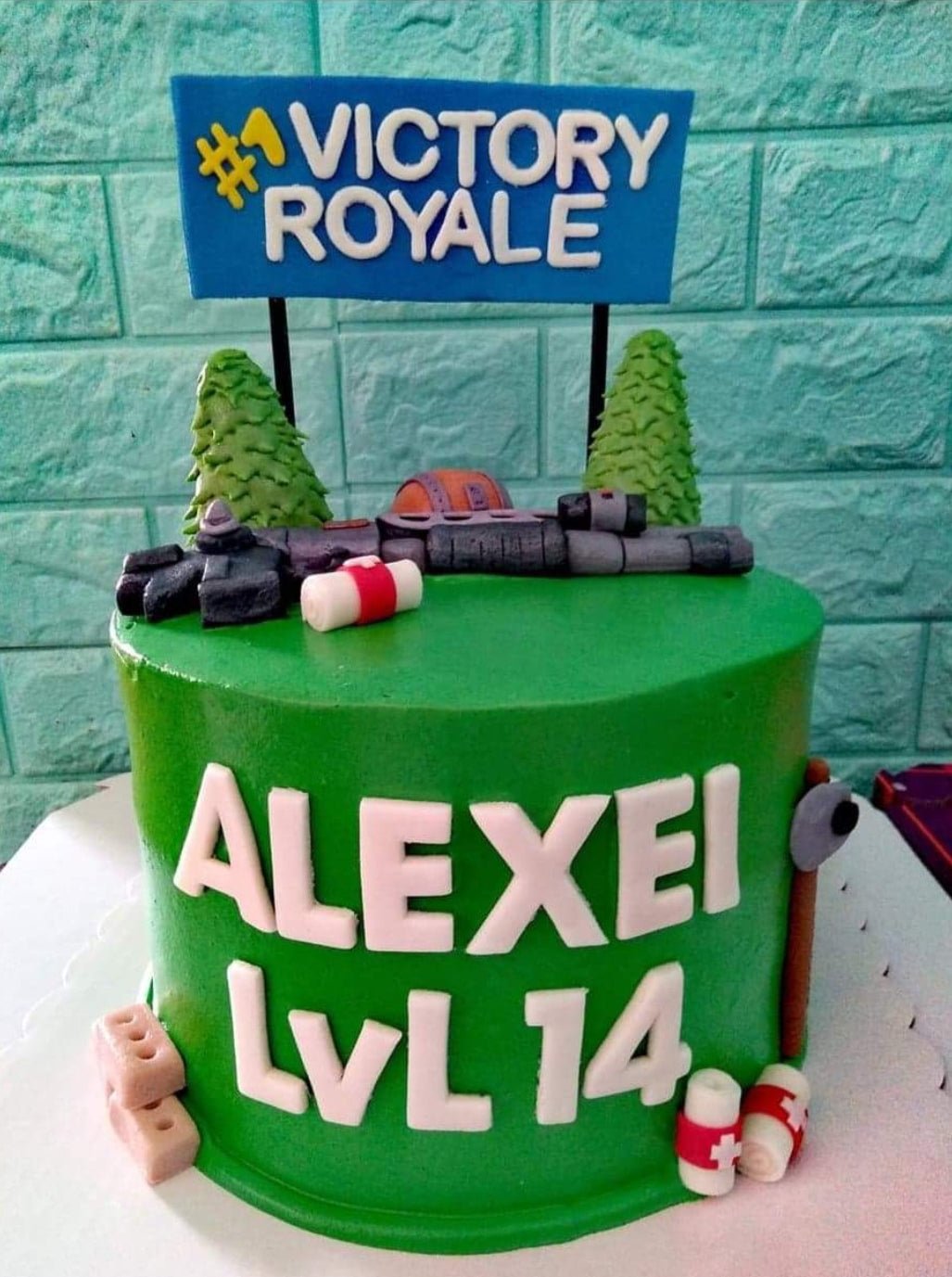 Green Fortnite themed birthday cake with Victory Royale banner, fondant trees, and a rifle topper for Alexei's 14th birthday.