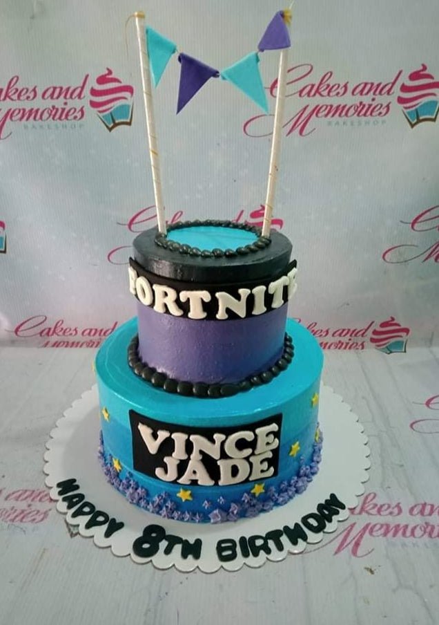 Two-tier Fortnite themed birthday cake in blue and purple with edible stars and a banner topper.