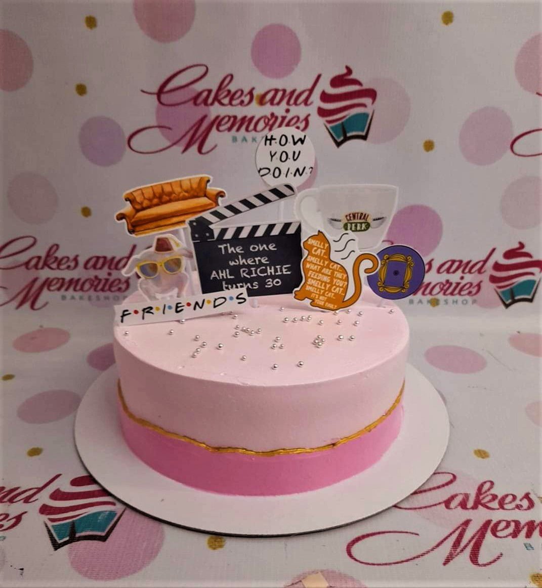 Pink Friends themed birthday cake with iconic show elements like the orange couch, Central Perk mug, and smelly cat printouts.