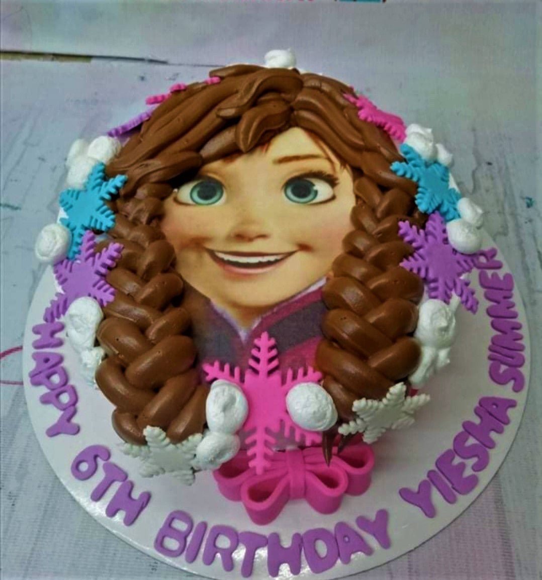 Frozen Anna character cake with brown icing braids, pink and blue snowflakes, and a purple birthday message on a white base.