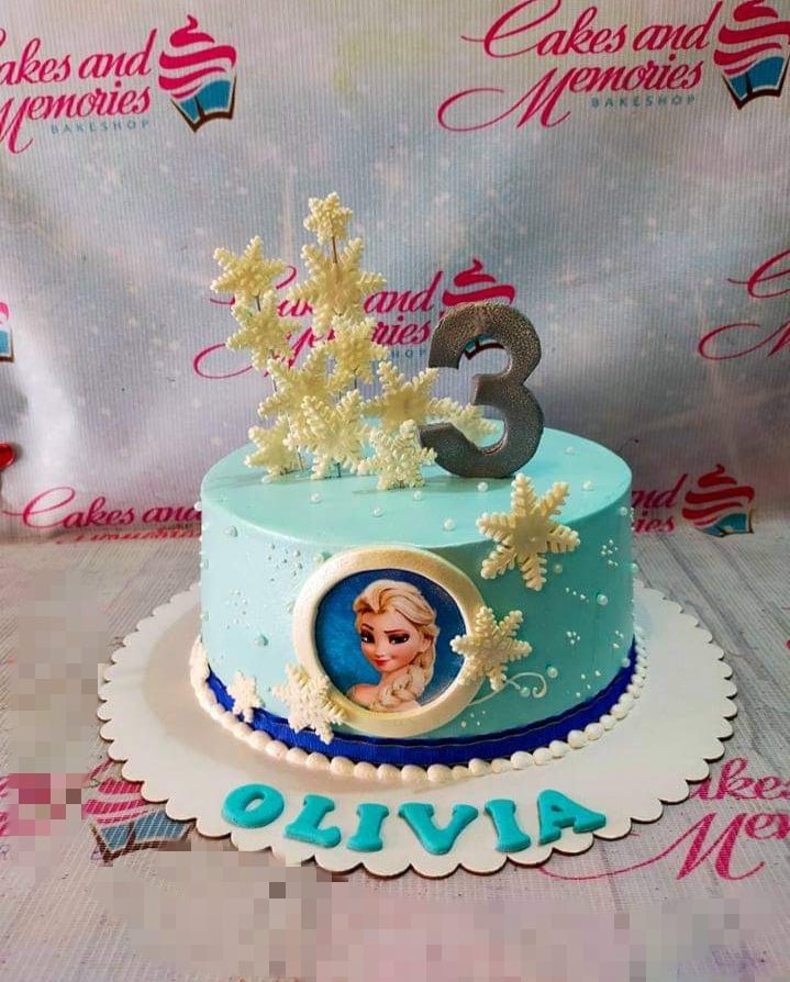 Light blue Frozen themed cake with Elsa printout, white snowflakes, and a silver number 3 topper.