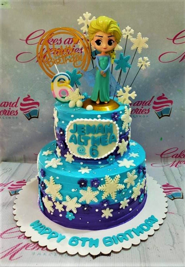 Two-tier Frozen themed cake in blue and purple with Elsa figurine, snowflakes, and a gold Happy Birthday topper.