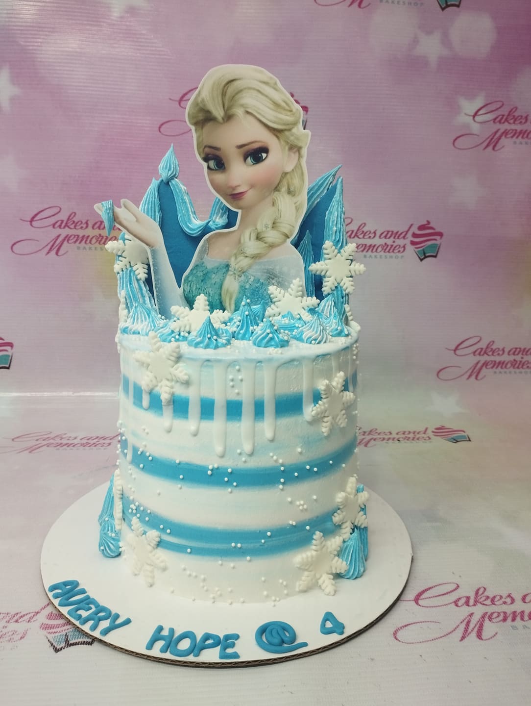 Blue and white Frozen themed Elsa cake with snowflake decorations and a large Elsa topper