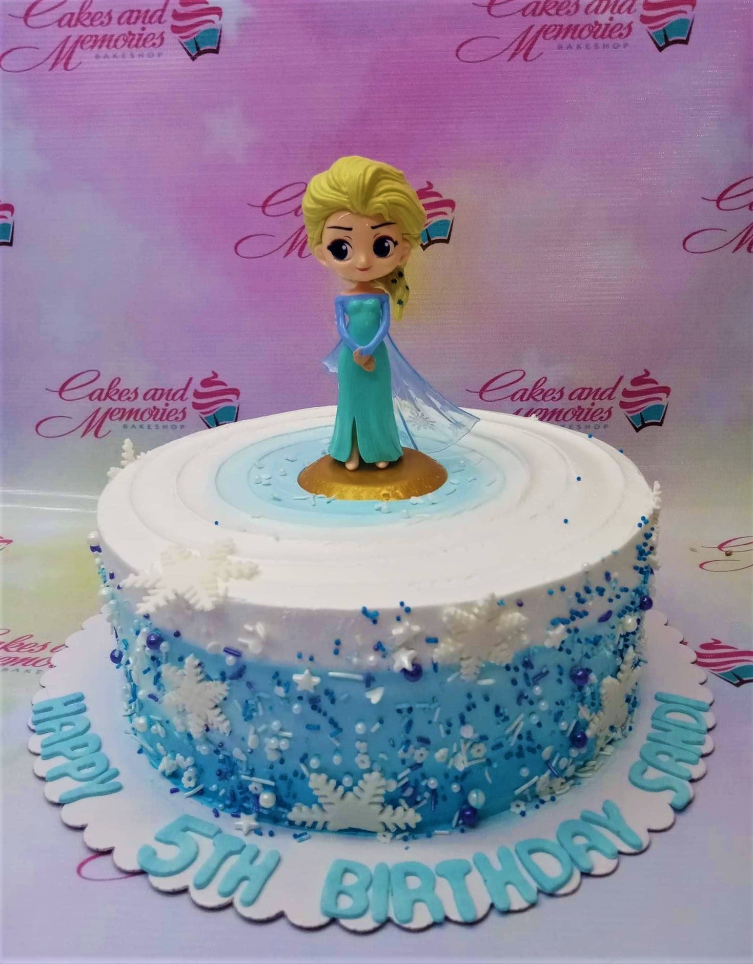 Frozen Elsa themed birthday cake with blue and white gradient icing, snowflakes, and a 3D Elsa figurine on top.