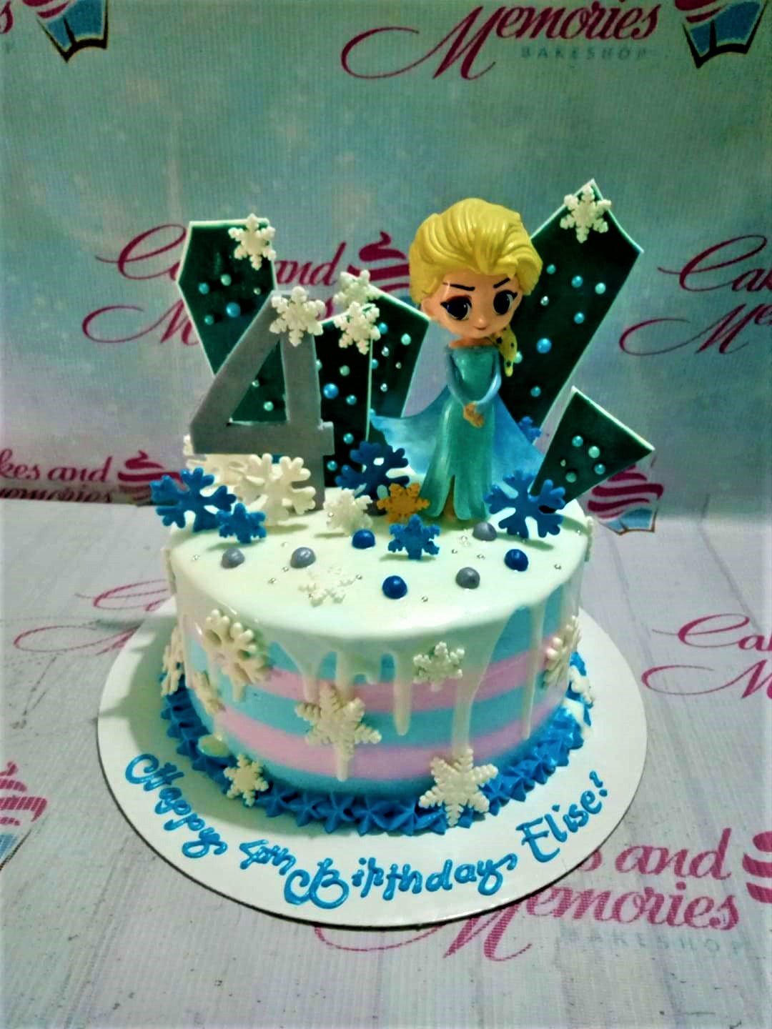 Frozen themed Elsa birthday cake with blue and pink striped icing, white chocolate drips, and snowflake decorations.