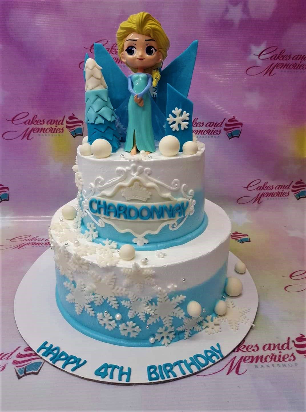 Two-tier Frozen themed Elsa cake in blue and white with snowflake decorations and a 3D Elsa figure on top.