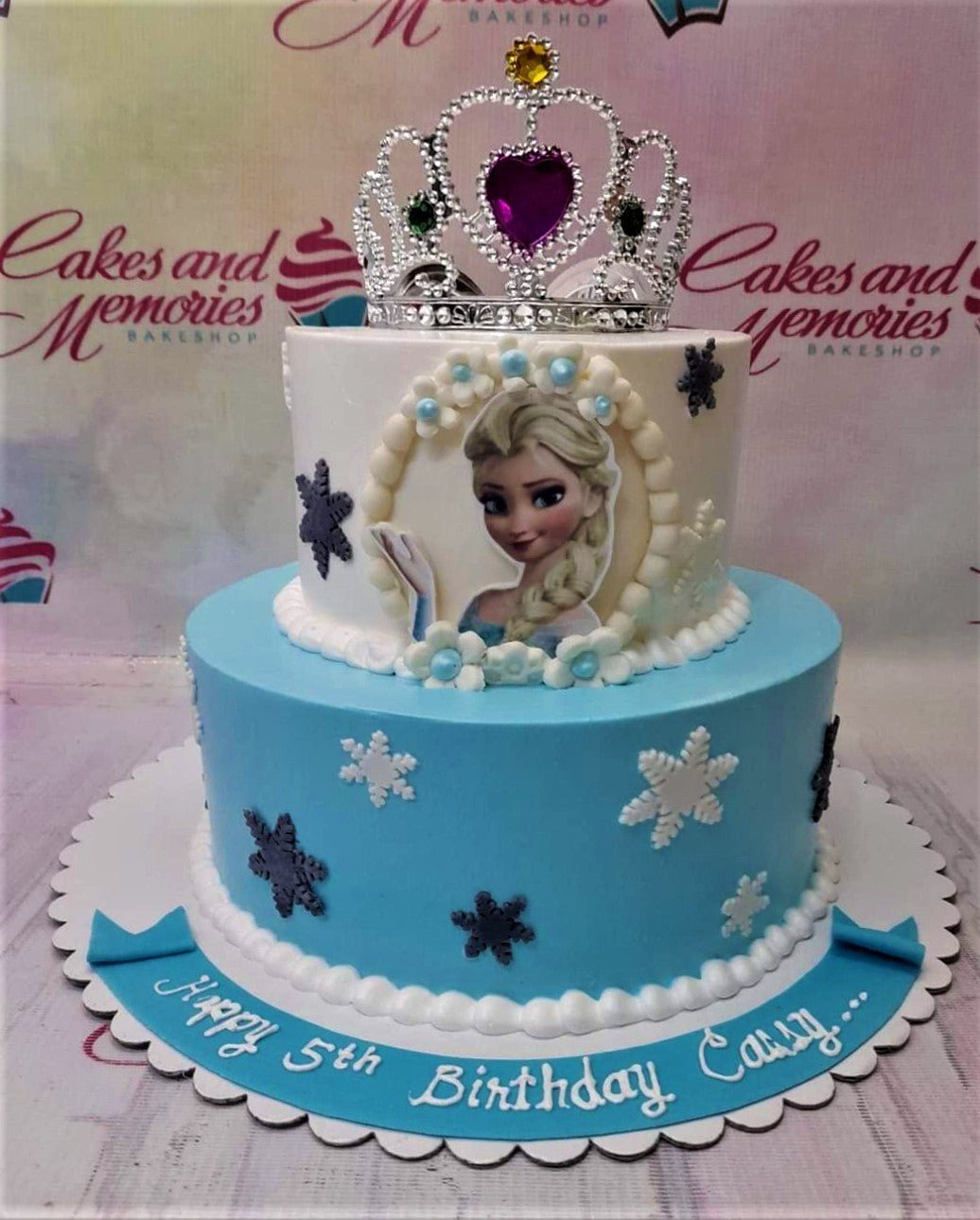 Two-tier Frozen themed cake with Elsa printout, silver tiara, and white and gray snowflakes on blue and white icing.