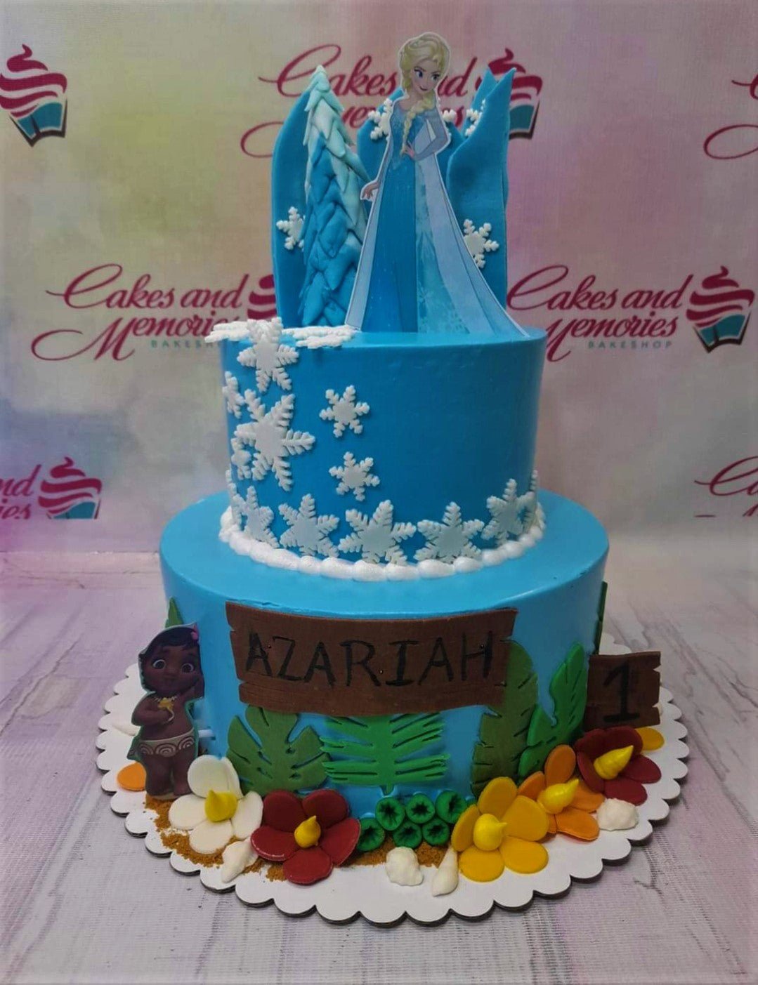 Two-tier blue Frozen and Moana themed cake with Elsa printout, snowflakes, and tropical gumpaste flowers.