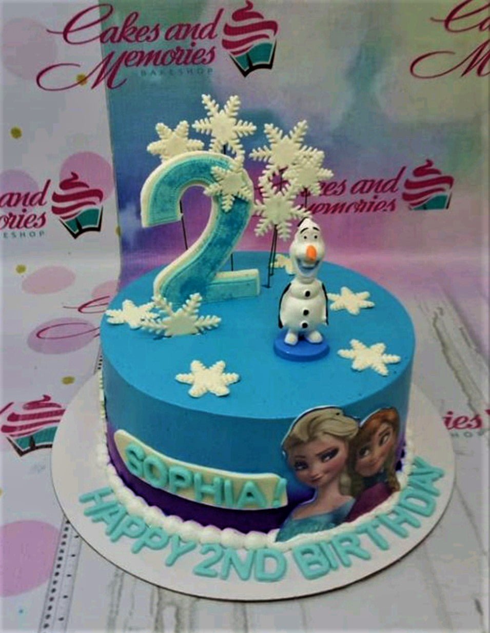 Blue Frozen themed birthday cake with Olaf figurine, snowflake toppers, and Elsa and Anna printouts.