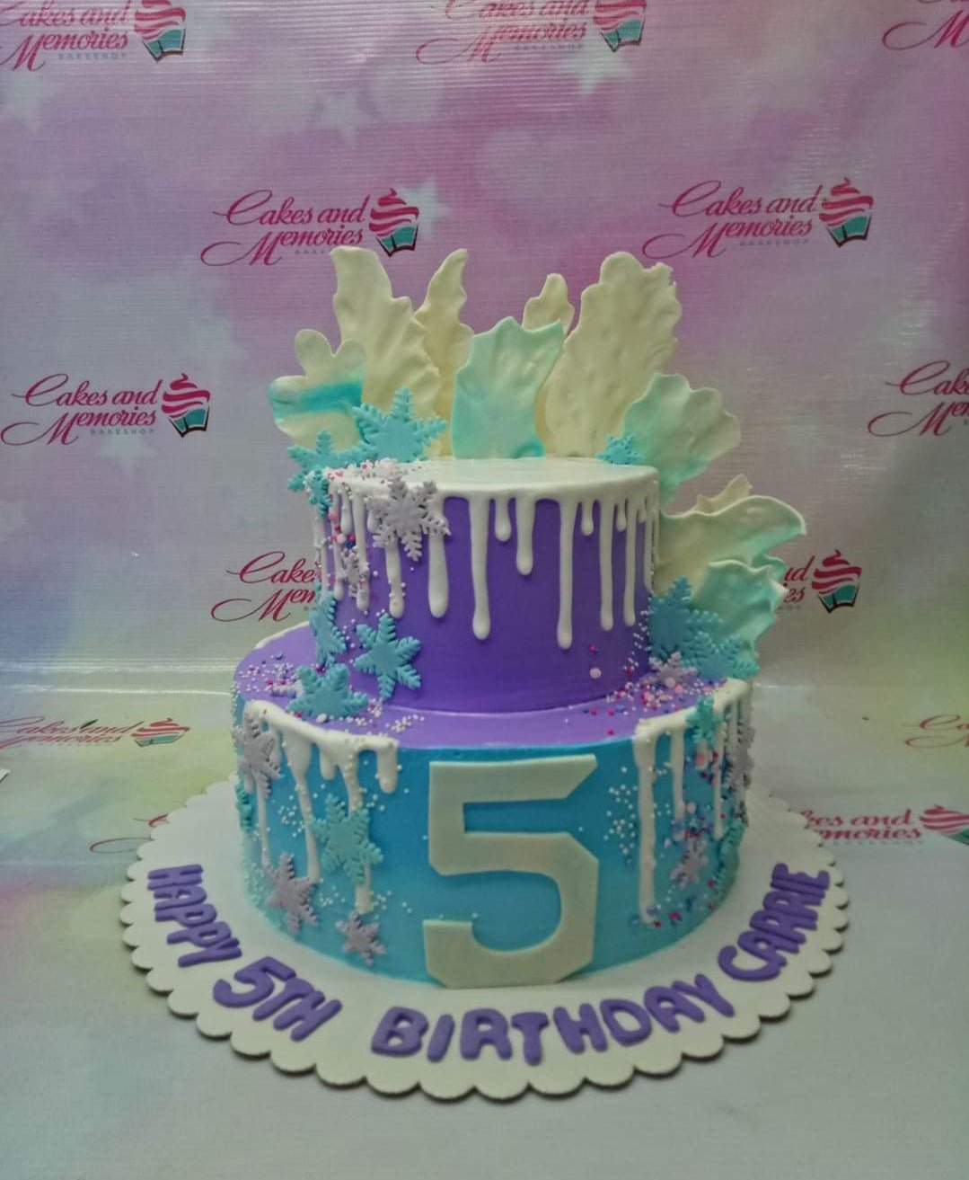 Two-tier Frozen themed birthday cake with purple and blue icing, white chocolate drips, and snowflake decorations.