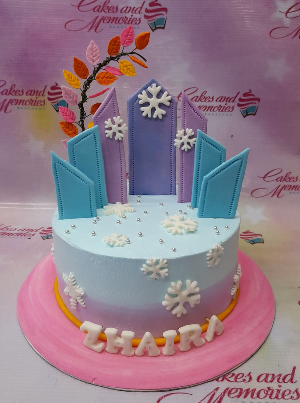 Light blue and purple gradient cake with white fondant snowflakes, blue and purple geometric panels, and a wire tree with orange and pink leaves.