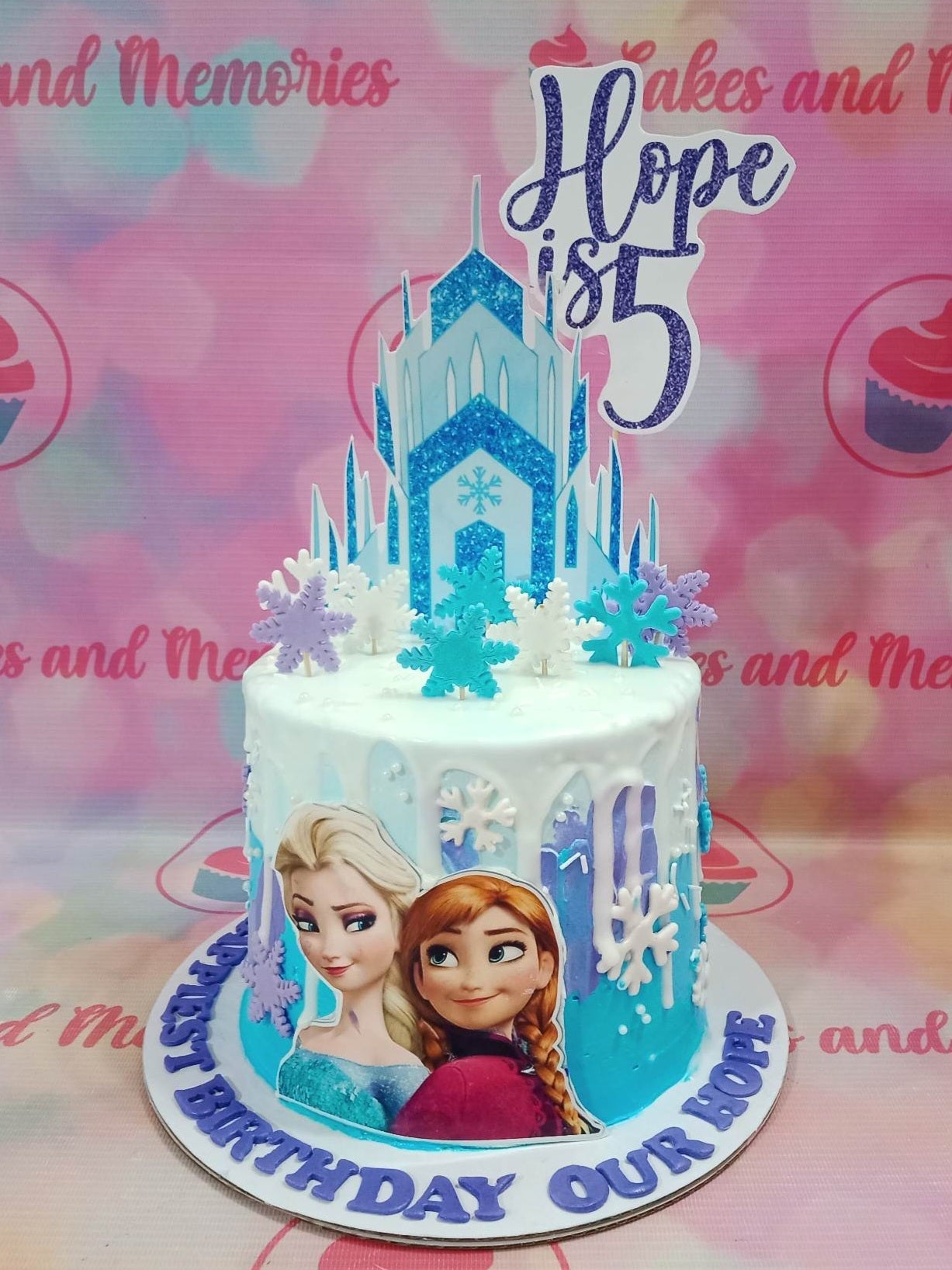 Frozen themed birthday cake with Elsa and Anna printouts, a blue glitter castle topper, and snowflake decorations on white and blue icing.