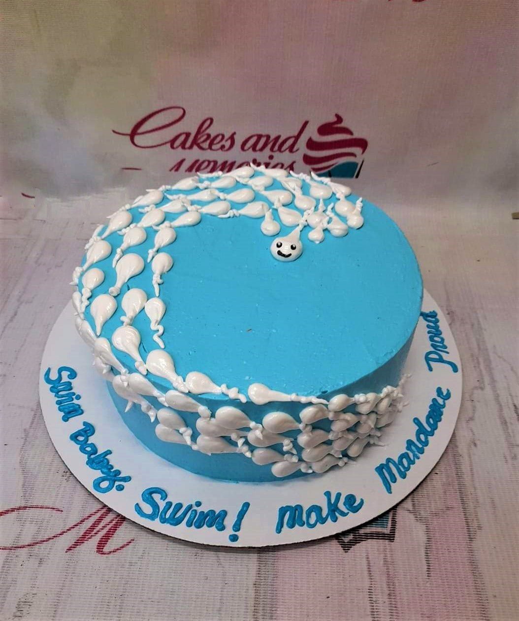 Blue round cake with white icing sperm-like decorations and a central smiling figure, featuring a message on the base board.