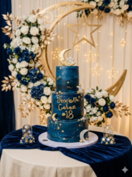 Three-tier navy blue galaxy themed cake with gold stars, crescent moons, and 18th birthday message.