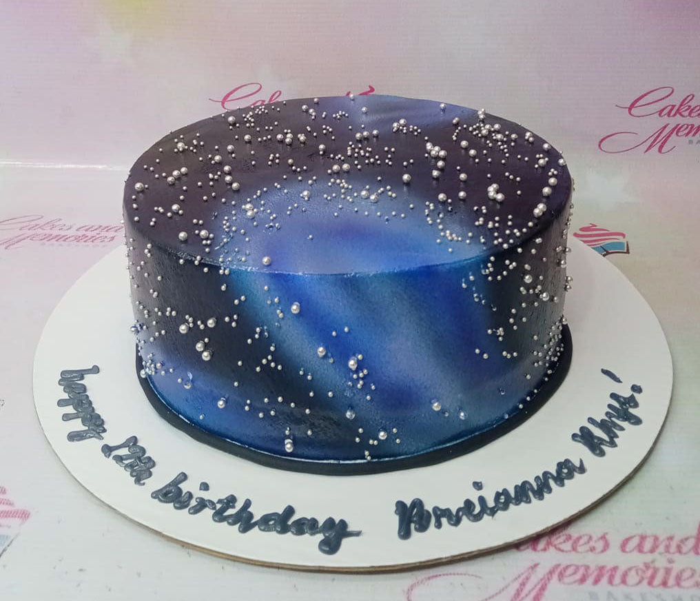 Galaxy themed birthday cake with blue and purple gradient icing and silver pearl sprinkles