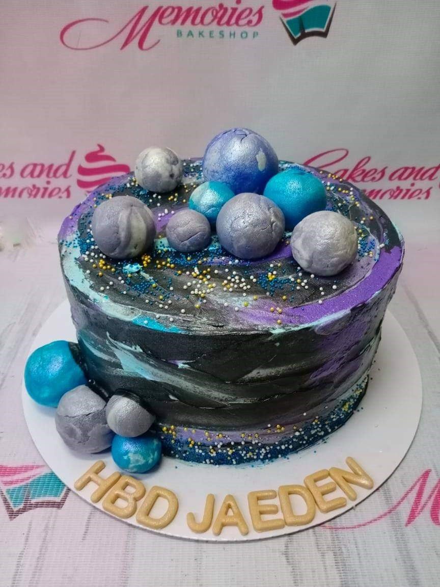 Galaxy themed birthday cake with black, purple, and teal swirled icing, topped with silver and blue fondant planets and gold sprinkles.