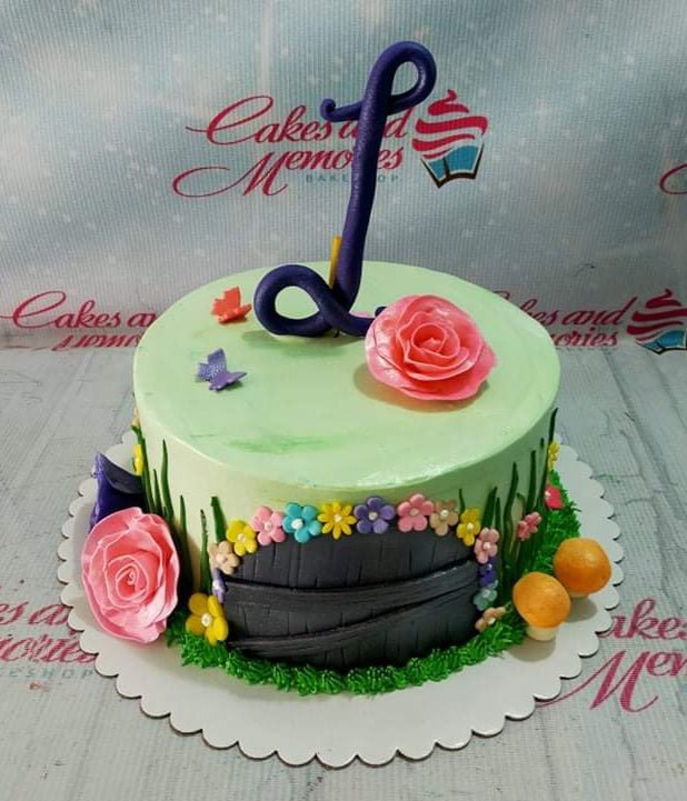 Light green garden themed cake with a large purple letter J topper, pink roses, and a wooden door design with colorful flowers.