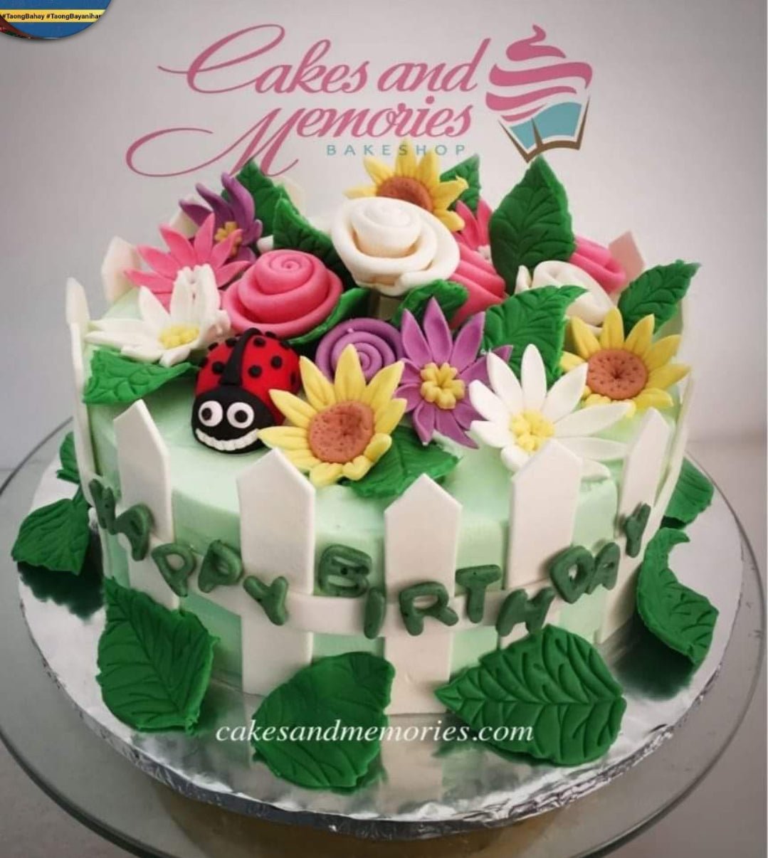 Light green garden themed cake with a white picket fence, ladybug, and various colorful fondant flowers like sunflowers and roses.