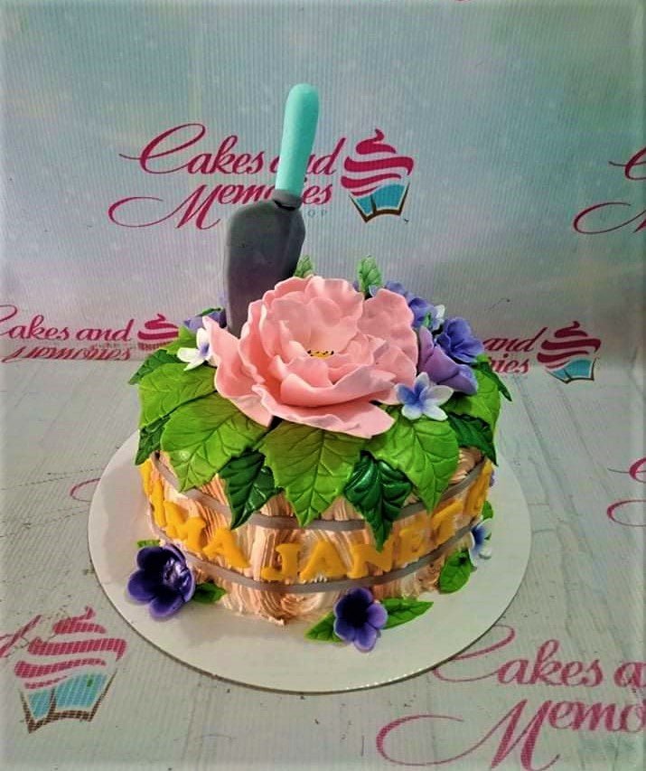 Garden themed cake with a large pink peony, purple flowers, green leaves, and a gardening trowel topper on a wood-textured icing base.