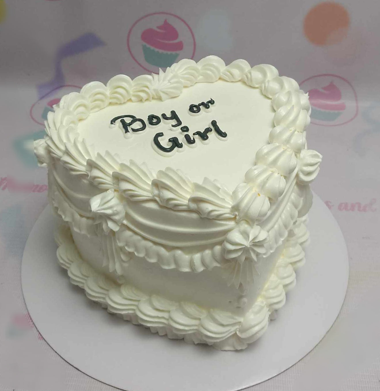 White heart-shaped bento cake with vintage-style piped icing ruffles and 'Boy or Girl' message for a gender reveal.